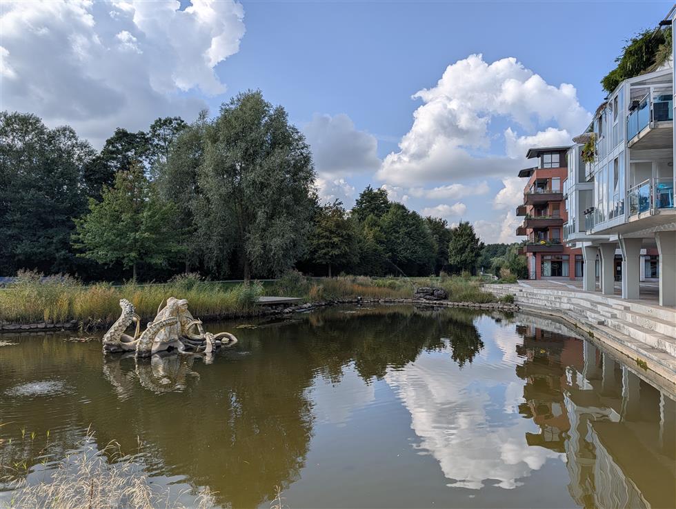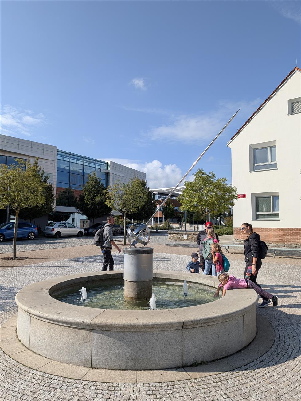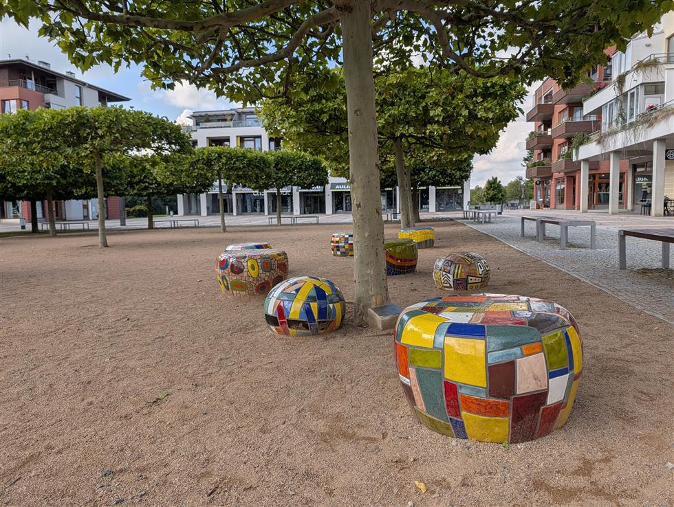 • náměstí Na Sádkách s křesílky a fontánou