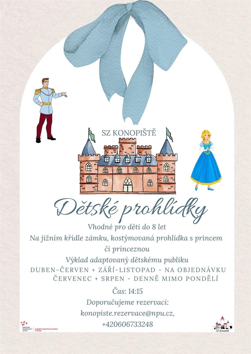 - Dětské prohlídky – vhodné pro děti do 8 let – probíhají v jižním křídle zámku a jedná se o kostýmovanou prohlídku s princem či princeznou. Výklad je adaptovaný na dětské publikum. Duben–červen a září–listopad – na objednávku, červenec a srpen – denně mimo pondělí. Čas je vždy 14:15. Doporučuje se rezervace na e-mailu konopiste.rezervace@npu.cz nebo na tel. č. +420 606 733 248.