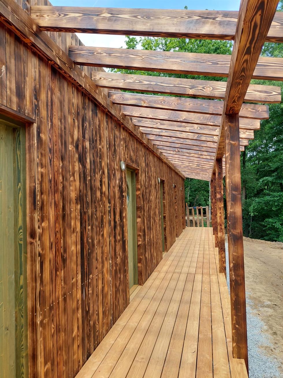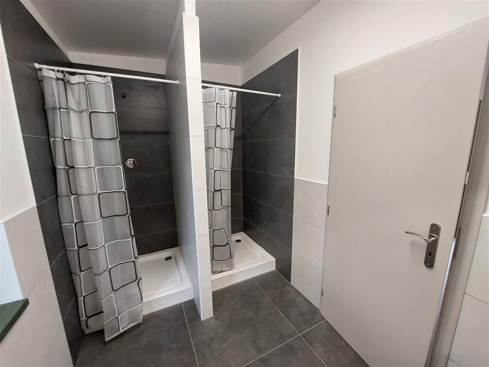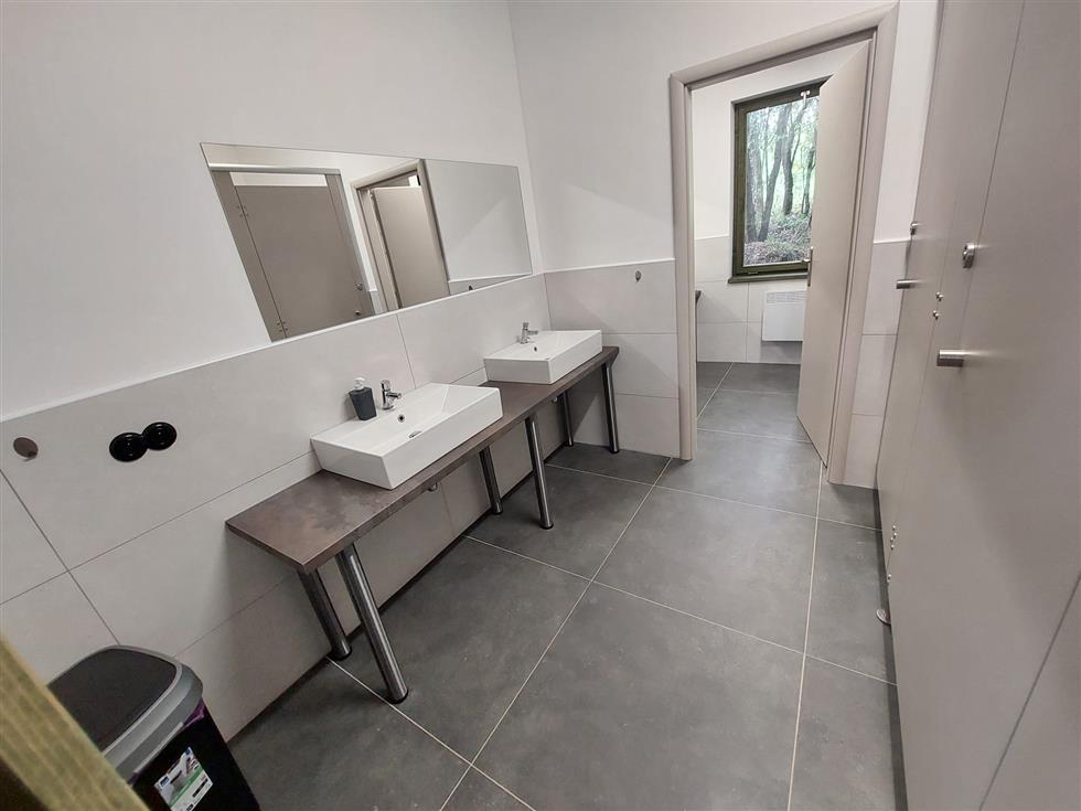 Dřevostavba má celkem 2 sociální zařízení (muži/ženy), z nichž každá obsahuje 4x umyvadlo, 2x sprcha, 2x WC + WC pro invalidy.